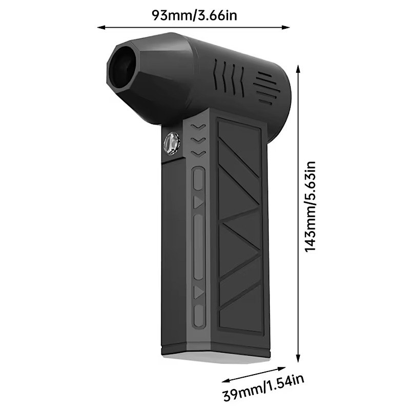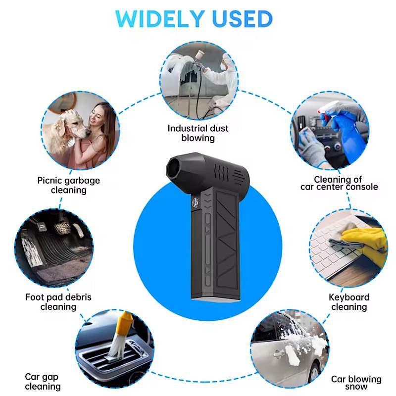 مناسب برای تمیز کاری ماشین، کامپیوتر، صفحه کلید، نظافت بیرونی، افروختن آتش و … قابل استفاده برای سفر، کمپینگ و ... دارای قابلیت تنظیم سرعت در سه سطح سرعت طراحی کوچک و جمعوجور دارای چراغ قوه باتری با عمر طولانی باطرفیت 5000 میلی آمپر شارژ از طریق Type-C با ولتاژ 7.4 ولت ابعاد 12.9 × 4.78 × 3.9 سانتیمتر